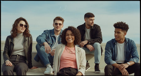 Group of young trendy people gathered together on stone railings and posing in sun light.