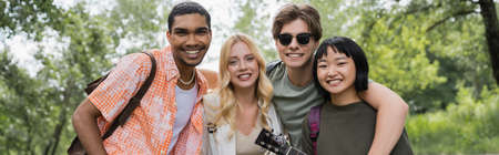 young and cheerful multiethnic tourists looking at camera in countryside, banner