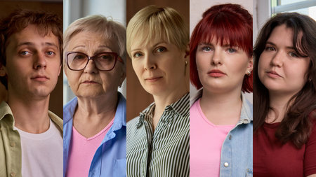Inner Warmth. Collage of serious and neutral expressions in close-up portraits. Motional profiling