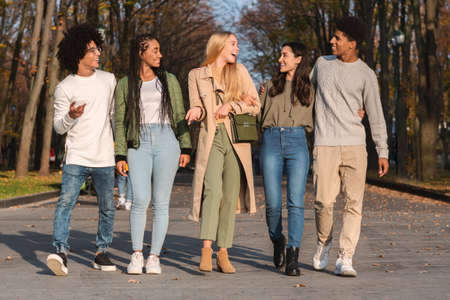 Multiethnic friends are walking in the park and looking at the camera, smiling