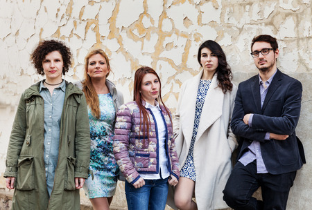 Multiethnic group of young hipsters stands together on street against gray brick wall. Diverse Stylish people in outerwear outdoor, youth culture