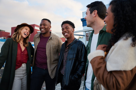 Stylish, diverse group of friends standing together rooftop at party in the city. City living at dusk.
