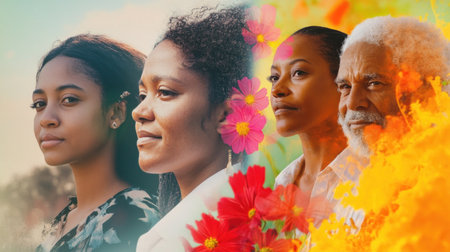 stylish african american friends standing in elegant attire on grey background, Juneteenth banner