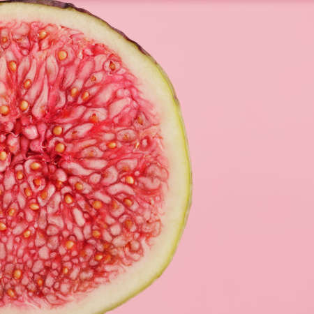 Macro photo of half figs on a pink background. Abstract fruit compositon.