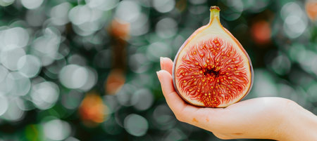 Close-up of hand presenting a ripe fig, highlighting its rich texture and color, set against a backdrop of lush foliage, emphasizing nature's bounty