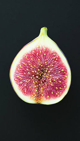 Close-Up of Half Fig Showcasing Seeds, Nutrients, and Fruit Anatomy Against Black Background