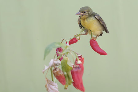 A little bird on a branch of red chilli with green background