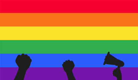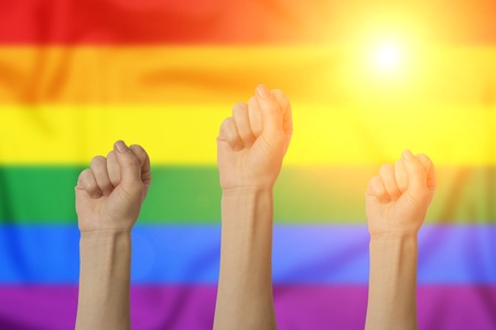 Female hand clenched into a fist and raised up on a background with LGBT flag. Concept of power, rebellion, unity, revolution.