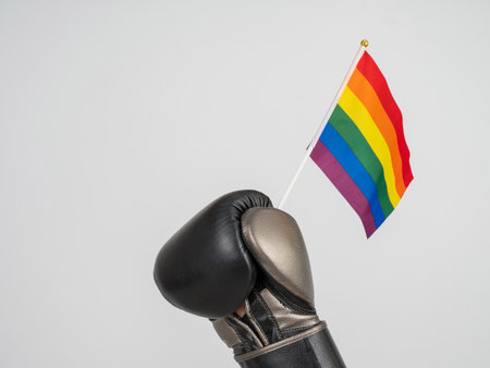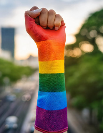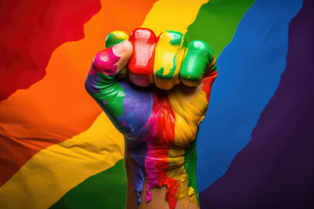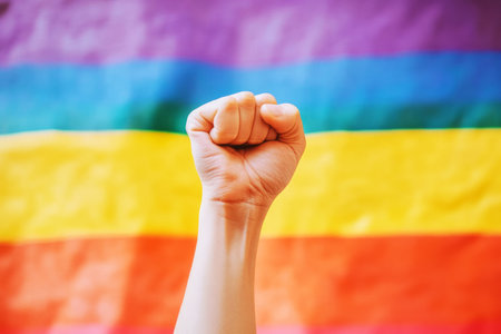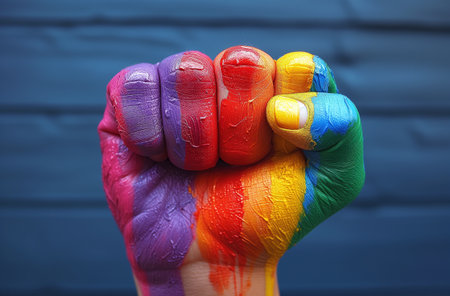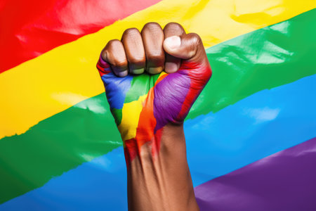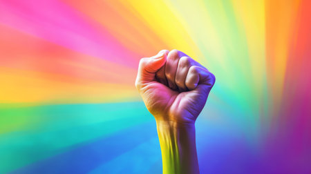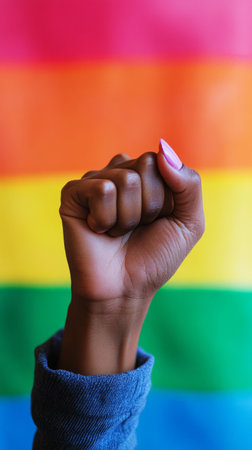 A close-up shot of a hand in a clenched fist, with a vibrant rainbow flag backdrop, symbolizing the powerful fight for love, equality, and human rights, conveying solidarity in diversity