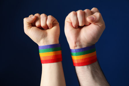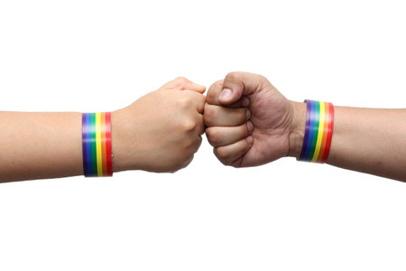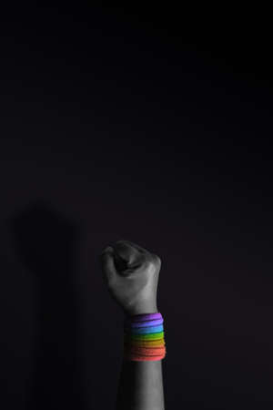 Isolate of a hand with an LGBT bracelet clenched into a fist as a symbol of the struggle for rights