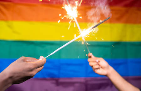 Pride month celebration showing by ligting sparklers against rainbow flag - conept of support, fireworks and rights.