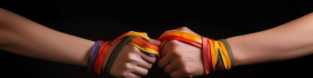 A raised fist wrapped in a rainbow bracelet, symbolizing LGBTQ+ pride and solidarity, set against a vibrant, colorful background.