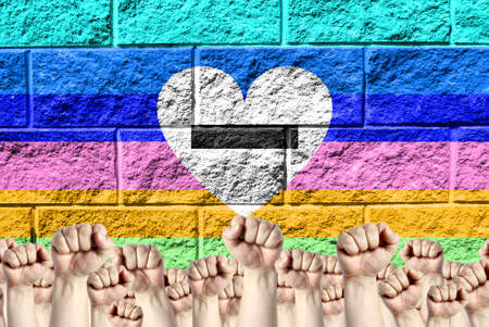 Raised fists against the background of the depicted flag of Antisexual on a brick wall, a concept of strength and unity.