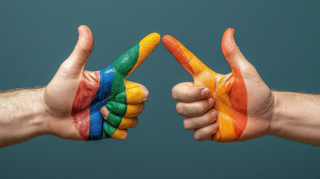 Two vibrant hands with colorful paint in a gesture of unity, celebrating diversity and inclusion. A perfect symbol for love and acceptance in communities.
