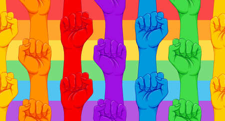 Striped hand showing fist raised up. Gay rights concept. Realistic style vector illustration in rainbow colors.