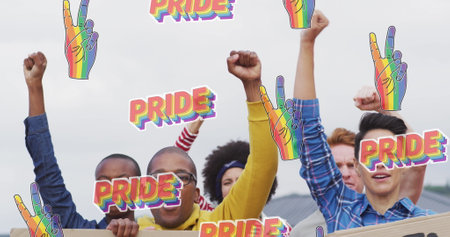 Image of rainbow hands and pride over diverse protesters with banners. lgbt rights and equality concept digitally generated image.