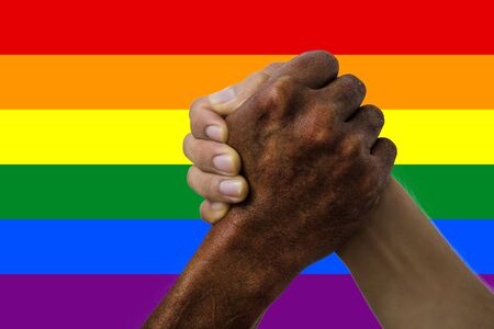 Black arm wearing a bracelet with the colors of the LGBT flag closing the fist as a symbol of strength and struggle. LGBT symbol.