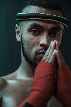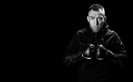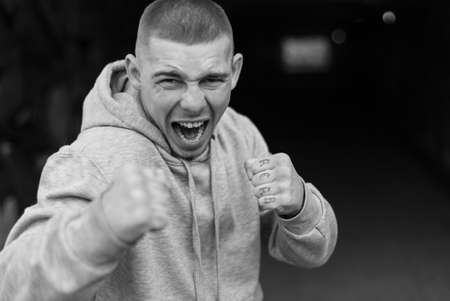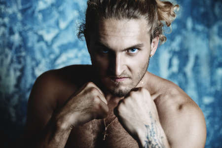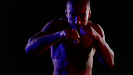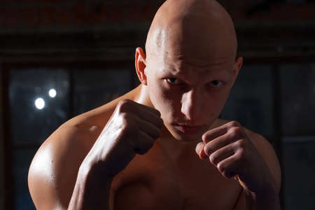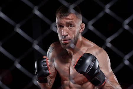 Fight club, MMA. Portrait of a muscular man fighter standing with clenched fists.