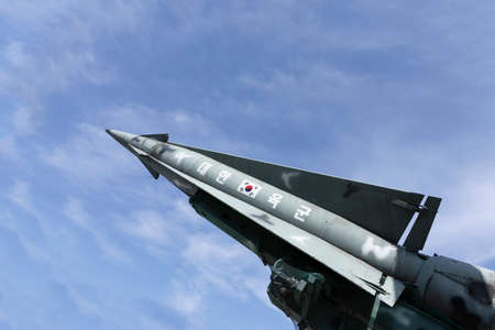 Pilot in uniform and flying helmet standing near an old war fighter-interceptor.