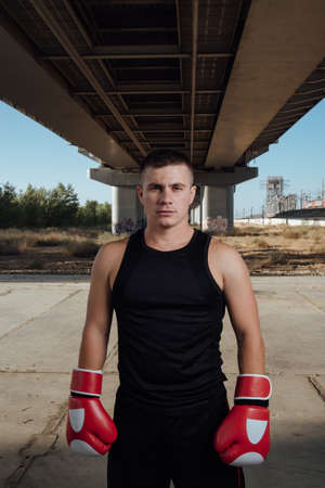 Boxer training outdoor. Male boxer training defense and attacks in boxing gloves. Strong muscular boxing man.