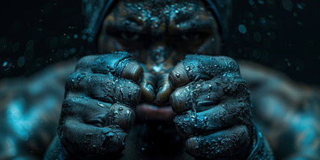 close-up shot of a boxers hands, tightly clenched, with sweat dripping from his knuckles. The background is blurry, suggesting the heat and intensity of a boxing match.