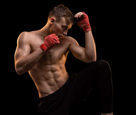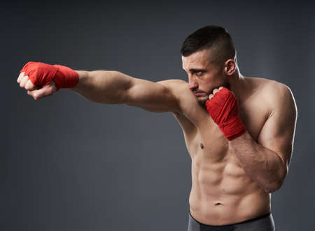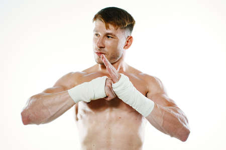 sporty man in red sports bandages on his hands fighting isolated on white background