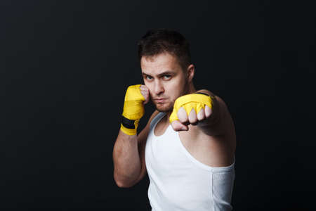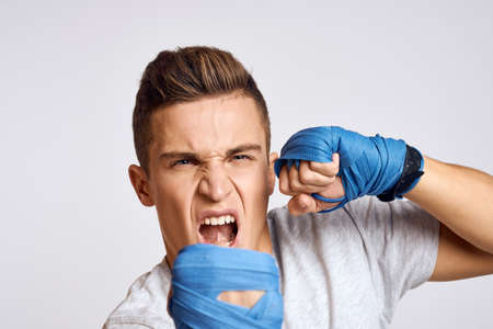 A sportive man in a white T-shirt boxing bandages on his hands practicing blow exercises improving skills