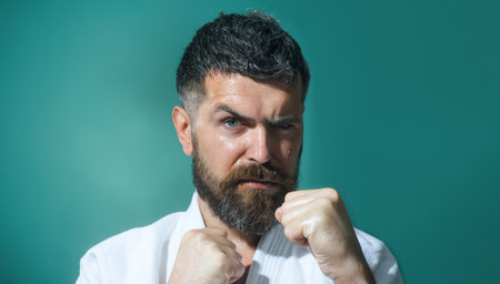 Karate man in fighting stance. Male karate fighter practices punches during karate training. Bearded man in white kimono with hands clenched in fist ready to fight. Karate man exercising combat sport.