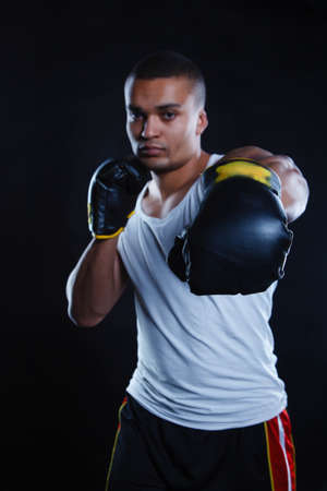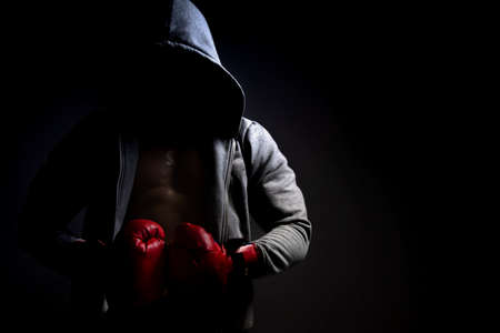 Man in red boxing gloves.Man boxer training in boxing gloves.Strength, attack and motion concept.Sporty man during boxing