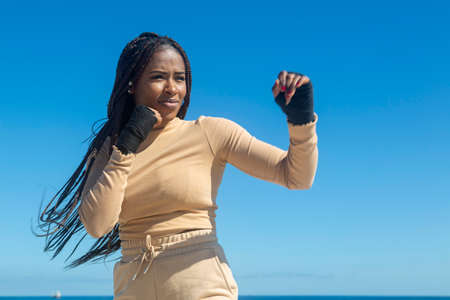 Young afro black girl training martial arts, boxing outdoors with sea and blue sky background. Attitude, sport, workout.