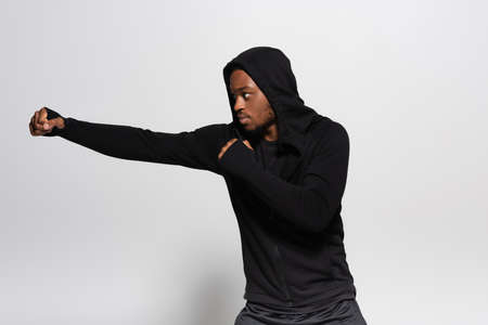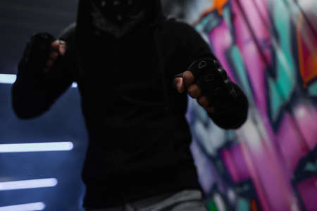 Cropped view of african american hooligan in gloves standing in fighting pose in garage
