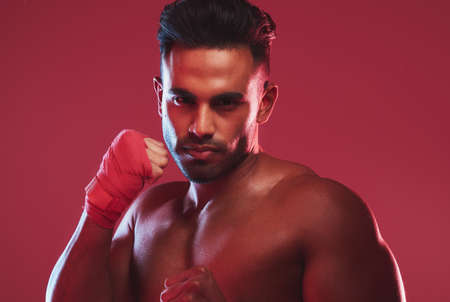 Portrait of one fit and strong handsome mixed race kickboxer isolated against a red studio background and getting ready to fight. Hispanic man posing shirtless in a punching stance. Focused on target