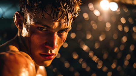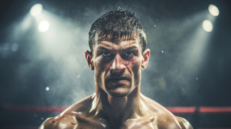 Brutal man fighter stands in the ring against the background of the arena and spotlights. He looks threateningly at the camera. The concept of fist fights. Mixed media