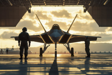 Two pilots stand by a fighter jet, preparing for flight as the sun sets in the background of the hangar.