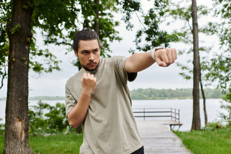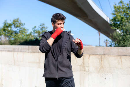 Young bearded male athlete boxer practicing punching technique while standing on the embankment