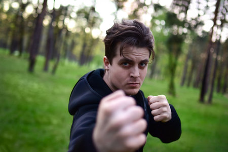 sporty young man in a sporty black jacket in a fighting pose raising his fist for a punch against a background of forest trees.