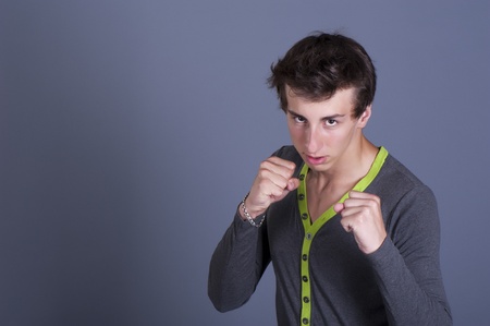 Aggressive strong athletic serious young boxing man, in a gray t-shirt, looking at the camera calmly and confidently. Close-up portrait of an aggressive young man holding his fists ready for fight.
