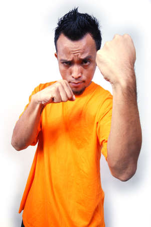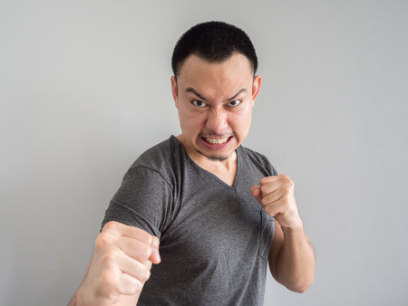 Photo image of funny Asian man showing cynical unhappy angry facial expression putting up his fist challenge to fight