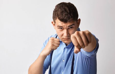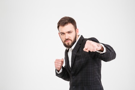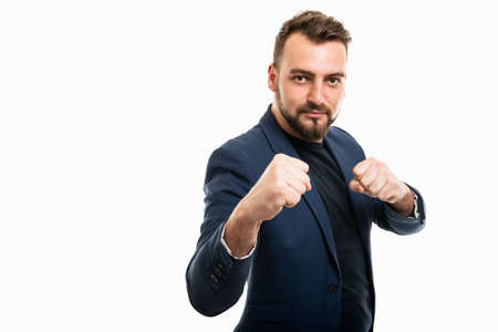 Business man wearing smart casual clothes showing fists like fighting isolated on white background with copy space advertising area