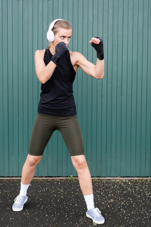 Fit young woman in a fighting stance wearing athletic sports wear and exercising by punching or practicing self defense. woman in fighting stance self defense