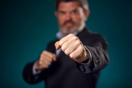 Man in suit showing fists at camera. Close up. Business and emotions concept