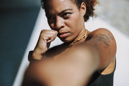woman boxing straight blow. self defence strength training and female fighter concept.