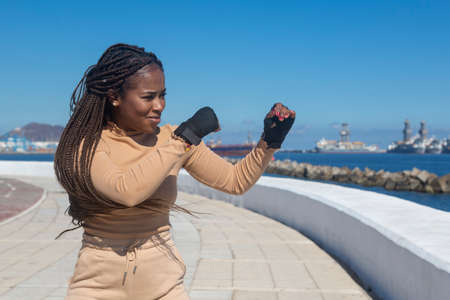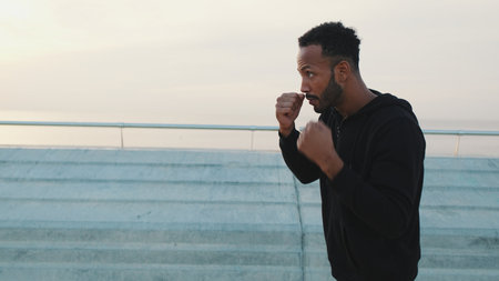 Attractive and fit young African American sportsman practicing boxing exercise during outdoor physical training in the morning