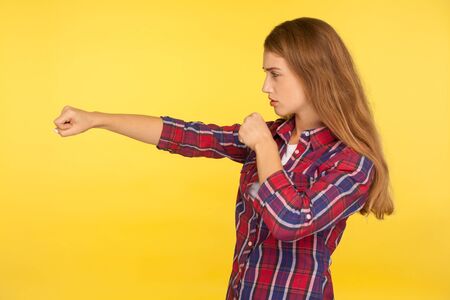 Profile of strong and determined ginger girl in checkered shirt punching air with fist and looking self-confident, female struggle, fighting spirit. indoor studio shot isolated on yellow background