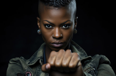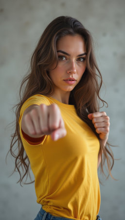 A determined young woman with long, flowing hair is poised to throw a punch, showcasing her strength and confidence. The image captures her fierce expression and athletic stance, set against a minimalist, textured background that emphasizes her powerful presence.
