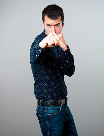 Young attractive man in rage looking furious in defence stance and threaten punching with fist in angry upset and mad face expression isolated grey background in youth violence and aggression concept.