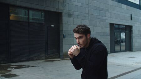 Male boxer training fist punch on workout outdoor. Closeup sportsman training box kick in slow motion. Side view of sexy guy practicing beats on urban street.
