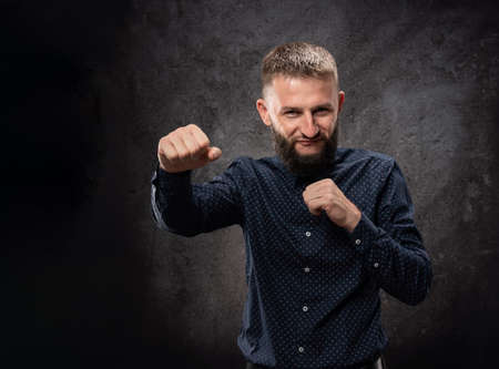 An emotional young man, a manager, imitates a punch as a winner and attacking player. On a dark textured background in the studio. High quality photo