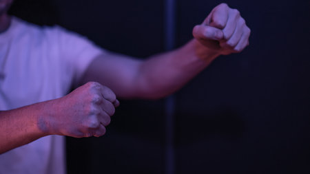 The concept of domestic violence. The boy clenched his fists and defends himself against aggression, ready to fight back. Black background. Copy space.
