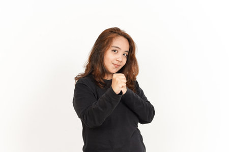 Punching fist to fight Of Beautiful Asian Woman Wearing Black Shirt Isolated On White Background